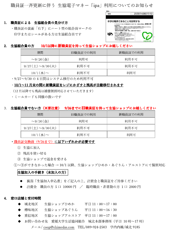 生協組合員の教職員の方は、10/1お近くの生協ショップで新職員証をお持ちいただければ、古いカードの残高を移行させていただきます。